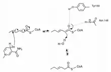 2,4 Dienoyl-CoA Reductase from Escherichia coli shares very similar kinetic properties to that of eukaryotes, but differs significantly in both structure and mechanism. In addition to NADPH, E. Coli DECR requires a set of FAD, FMN and iron–sulfur cluster molecules to complete the electron transfer.[12] A further distinction is E. Coli DECR produces the final 2-trans-enoyl-CoA without the need for Enoyl CoA Isomerase.[11] The active site contains accurately positioned Tyr166 that donates a proton to the Cγ after hydride attack at the Cδ, completing the reduction in a single concerted step.[13] Surprisingly, mutation of the Tyr166 does not eliminate enzyme activity but instead changes the product to 3-trans-enoyl-CoA. The current explanation is that Glu164, an acidic residue in the active site, acts as a proton donor to Cα when Tyr166 is not present.[14]