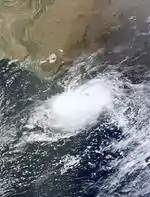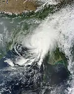 Early on December 28, the JTWC reported that Thane had become the equivalent to a category one hurricane on the SSHS before later that day the IMD reported that Thane had become the first Very Severe Cyclonic Storm of the season.[61][62] During December 28, Thane continued to intensify, and developed a small pinhole eye, before the JTWC reported that Thane had attained its peak intensity early on December 29 with 1-minute sustained wind speeds of 165 km/h (105 mph).[63][64] The IMD then followed suit and reported that the system had peaked as a Very Severe Cyclonic Storm with 3-minute sustained windspeeds of 140 km/h (85 mph).[65] During the rest of that day, the system continued to move westwards and weakened slightly as it started to interact with land. Thane then made landfall as a very severe cyclonic storm early on December 30 on the north Tamil Nadu coast between Cuddalore and Pondicherry.[66] After making landfall, Thane rapidly weaken into a depression before the JTWC issued their final advisory during December 30, while the IMD continued to monitor the remnants of Thane until the depression weakened into a well marked low-pressure area on December 31.[66]