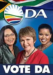 Port Elizabeth lies in a unique region roughly at the border between the Black and Coloured (i.e. mixed raced) population groups. It was predicted that there would be a strong effort from minorities in the city to try to gain control of the council. Although the Nelson Mandela Bay municipality is over 60% black, the DA hoped that by using COPE and the United Democratic Movement, the vote for the ANC could have possibly been lowered under 50% (i.e. minority power) enabling the DA to form a coalition with smaller parties and assume governance of the area. The Nelson Mandela Bay municipality was heavily contested in the elections with the ANC managing to secure 63 seats to the DA's 48 seats. Zille attributed the failure of the DA to win the metro to the decline of COPE, claiming that the latter's retention of votes could have unseated the ANC allowing a coalition government in the metro.[6]