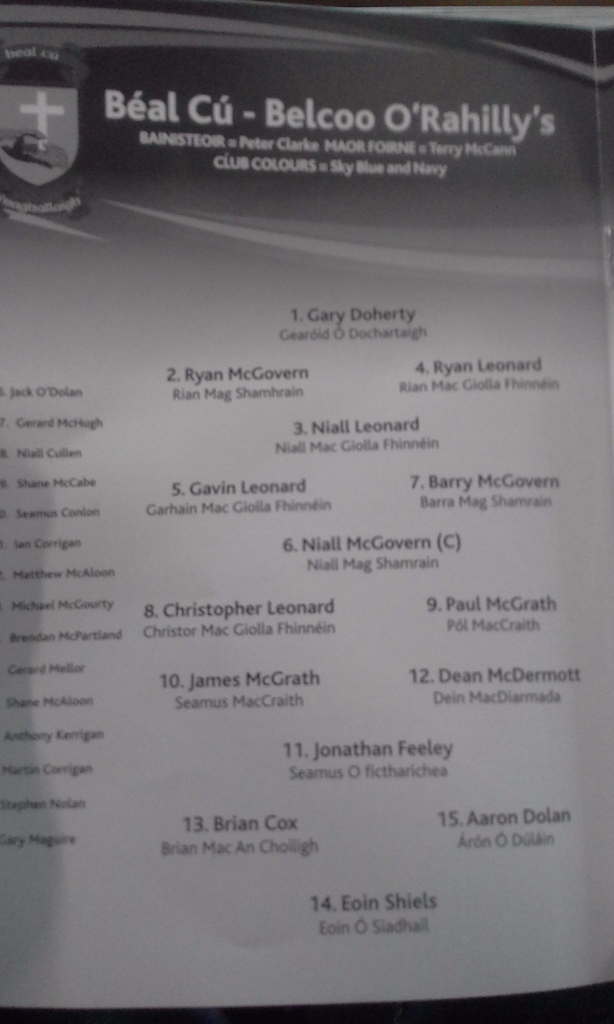 | Killian Clarke 0-5 (0-2f), Declan McIntyre 1-1, Ryan Clerkin 1-0, Niall Clerkin 0-1 | av av | Ryan McElhone 0-6 (0-4f), Eamon Burke and Mark McGrogan (0-1f) 1-2 each, Conor Doherty 0-3, Danny Mulholland 0-2, Michael Bateson, Padraig McGrogan, Kevin Sweeney (0-1f), Sean Patrick McCann, Ciaran Devlin 0-1 each |