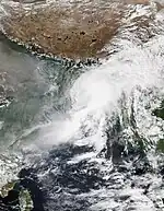 At 00:00 UTC on May 16, a depression formed in the southeast Bay of Bengal and was identified as BOB 01. Six hours later, the India Meteorological Department (IMD) upgraded the system to a deep depression. The system began bringing torrential rainfall to Sri Lanka and Southern India. Around 15:00 UTC, the system further developed into Cyclonic Storm Amphan.[2][3] That morning, landslide and flooding warnings were hoisted for parts of eastern Sri Lanka and the Indian state of Kerala were given expectations of torrential rainfall in the coming days.[4] By 09:00 UTC on May 17, Amphan had intensified into a very severe cyclonic storm. Within 12 hours, the storm had developed an eye and started to rapidly intensify, becoming an extremely severe cyclonic storm. According to the JTWC, it explosively intensified from a Category 1-equivalent cyclone to a Category 4-equivalent cyclone in just 6 hours. The following morning around 10:30 UTC, the IMD upgraded Amphan to a super cyclonic storm with 3-minute sustained winds of 240 km/h (150 mph) and a minimum pressure of 920 hectopascals (27.17 inHg). This marked the second year in a row featuring a super cyclonic storm, the previous year seeing Kyarr in the Arabian Sea. On May 20, at approximately 17:30 IST, the cyclone made landfall near Bakkhali, West Bengal after weakening subsequently. It rapidly weakened once inland, and dissipated on the next day. It left behind a trail of catastrophic damage, and was later confirmed to be the costliest storm ever recorded in the basin.