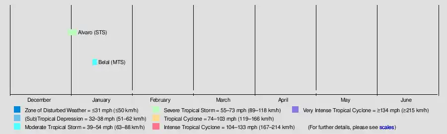 | Belal | 11 January – Present | Moderate tropical storm | 85 km/h (50 mph) | 991 hPa (29.26 inHg) | None | None | None | |