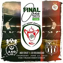The 2023 Algerian Cup final was the 56th final of the Algerian Cup. The final took place on June 22, 2023, at Miloud Hadefi Stadium in Oran with the kick-off at 17:00 between ASO Chlef and CR Belouizdad.[1] The first to reach the final is ASO Chlef, the winner against JS Saoura. This is the third time that the team reached the final, ASO won the title once in 2004–05.[2] The other competing club is CR Belouizdad, the winner against NC Magra to reach the final for the twelfth time where CRB crowned it eight times and the last one to win the cup in 2019, before the competition was temporarily canceled due to the COVID-19 pandemic.[3]