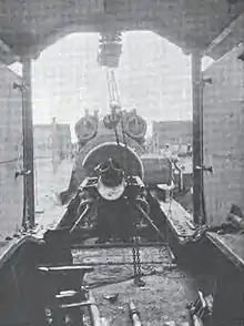 Ammunition on the E. u. B. was moved by means of a shot tray provided with two two-man handles, a yoke above with an eye and wheels so that shells could be moved by hand, rolled or carried by the trolley hoist which runs along the overhead rail. An extensible rail could raised and braced in place to reach shells placed on the ground on in an ammunition car behind the mount. The shot tray could be hooked to the breech to hold the powder and shell in place while they were manually rammed.[4] The gun had to be loaded at zero elevation and thus had to be re-aimed after every shot. The "Peter Adalbert" fired several different shells with weights between 113.5 and 115 kilograms (250 and 254 lb). It used the German naval system of ammunition, where the base charge was held in a metallic cartridge case and supplemented by another charge in a silk bag which was rammed first.[2]