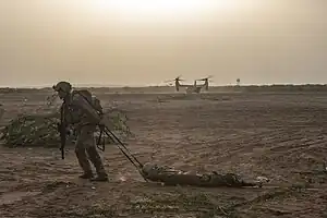 A pararescueman from the wing's 82nd Expeditionary Rescue Squadron drags a litter during an exercise in Djibouti, 2023