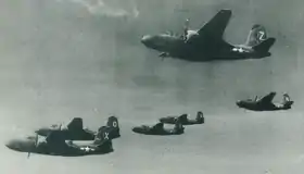 The unit operated from Noemfoor from September to December 1944, attacking airfields and installations on Ceram, Halmahera, and western New Guinea.[5] Noemfoor operations included attacks on oil installations.[9] The 417th moved to the Philippines in December 1944 at the end of the New Guinea campaign. The group's ground crews left Noemfoor by ship while the aircrew flew to the Philippines once the advance party had prepared McGuire Field for use in late December.[10] While en route, the convoy transporting the ground echelon endured two Japanese air attacks.[11]
