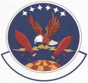 - ↑ Approved 18 February 1952. Description: On a shield sky blue, between a cross red, edged white, in the two upper quarters, six bombs, points downward, three on either side of the cross, white, shaded blue, in the two lower quarters eight stars, four on each side of the cross, white, markings blue, in base over the cross a sphere white, markings blue, over the center of the cross a star white. thereover an eagle flying blue, markings white.