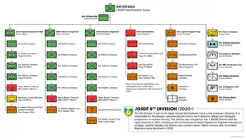 The 6th Division (第6師団, Dai-roku Shidan) is one of nine active divisions of the Japan Ground Self-Defense Force. The division has been subordinated to the North Eastern Army and is headquartered at JGSDF Camp Jinmachi, in Higashine, Yamagata Prefecture, in northern Japan. Its responsibility is the defense of Fukushima, Miyagi and, Yamagata prefectures.
