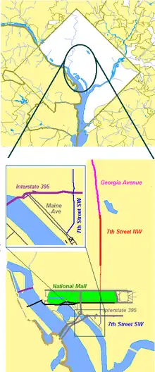 7th Street SW begins at Water Street, near the banks of the Washington Channel. It crosses above Interstate 395 approximately two blocks before it intersects with Maryland and Virginia avenues near the U.S. Department of Transportation and the U.S. Department of Housing and Urban Development buildings, which are located across the street from each other on 7th Street SW.