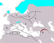 It is believed that European sites settled before 8500 were still Palaeolithic, or at best Mesolithic, communities. At Star Carr in North Yorkshire, the results of radiocarbon analysis in 2018 indicate that occupation first commenced between 9335 and 9275 BC, lasting for a period of around 800 years until 8525–8440 BC, although such occupations may have been episodic in nature, varying in intensity between different periods.[14] Archaeological excavations at Cramond in prehistoric Scotland have uncovered evidence of habitation dating to around 8500 BC.[15] Another settlement may have been established at Ærø in Denmark.[16]