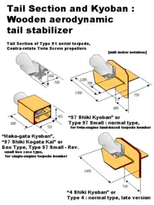 In 1931, the Japanese Navy developed the Type 91 torpedo, intended for a torpedo bomber to drop from a height of 330 feet (100 m) and a speed of 100 knots (190 km/h; 120 mph).[22] In 1936, the torpedo was given wooden attachments to the tail, nicknamed the Kyoban, to increase its aerodynamic qualities—these attachments were shed upon hitting the water. By 1937, with the addition of a breakaway wooden damper at the nose, the torpedo could be dropped from 660 feet (200 m) and a speed of 120 knots (220 km/h; 140 mph). Tactical doctrine determined in 1938 that the Type 91 aerial torpedo should be released at a distance of 3,300 feet (1,000 m) from the target.[22] As well, the Japanese Navy developed night attack and massed day attack doctrine, and coordinated aerial torpedo attacks between land- and carrier-based torpedo bombers.[22]