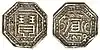 Ahom coinage or Coins of Ahom Kingdom, issued from 1648 CE –1824 CE. First Ahom coin was issued by Jayadhwaj Singha (r. 1648–1663)[1] and the last Ahom king to issue coin was Jogeswar Singha (r. 1821–1824). Coins were usually struck in octagonal shape, but square and round shapes coins were also issued but in limited quantity for special occasions and trade, the obverse of the coin contained the name of the king and date of coin and the reverse contained the imprint of the deity of the concerned king.[2] The script used in coins was mainly Assamese, a few coins in Devanagari and Persian scripts were also issued. Ahom script in coins were extensively used during the war with Mughals. Chinese script was also used in order to meet out trade with Tibet, but is extremely rare.[3]
