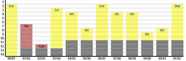 Red = Scottish Football League Premier Division (before Scottish Premier League)