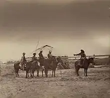 In one model of bride kidnapping present in Kyrgyzstan, the young man decides he wishes to marry and asks his parents to pick him out a suitable bride, or is told by his parents that it is time he settled down and that they have found someone of the right background and attributes. (In this sense, it may be similar to an arranged marriage, although the arranging is all on one side.) The prospective groom and his male relatives or friends or both abduct the girl (in the old nomadic days, on horseback; now often by car) and take her to the family home. Once there, the man's relatives may attempt to convince the woman to accept the marriage, and to place a white wedding scarf (jooluk) on her head to symbolize her agreement.[23] They may do this by pointing out the advantages of the union, such as the wealth of their smallholding, to show her what she would gain by joining their family. Families may use force or threaten to curse the woman if she leaves, an effective threat in a superstitious country.[24] Some families will keep the girl hostage for several days to break her will. Others will let her go if she remains defiant; she may, for example, refuse to sit down or to eat, as a sign that she is refusing the proffered hospitality. During this period, the groom typically does not see the bride until she has agreed to marry or at least has agreed to stay. The kidnapped woman's family may also become involved, either urging the woman to stay (particularly if the marriage is believed socially acceptable or advantageous for the prospective bride and her family), or opposing the marriage on various grounds and helping to liberate the woman.[25]