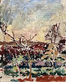 In Giacometti's whole body of work, his painting constitutes only a small part. After 1957, however, his figurative paintings were equally as present as his sculptures. The almost monochrome paintings of his late work do not refer to any other artistic styles of modernity.[10]