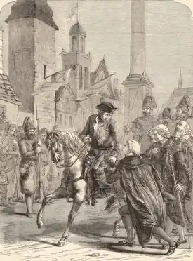 Then, Alexander served under the command of General-Major Maxim Berg. Suvorov successfully defended his positions at Reichenbach, but contrary to his future rules did not pursue the retreating enemy, if the only surviving account of this action is accurate. At the skirmish of Schweidnitz, in a third assault, Suvorov managed to take the hill occupied by the hussar picket; in this clash 60 Cossacks opposed 100 hussars.[33] For another example, in the combat of Landsberg on 15 September 1761, his Cossack-hussar cavalry unit defeated 3 squadrons of the Prussian hussars.[34] On leaving the Friedberg Forest, he hit General Platen's side units and took many prisoners.[33] He also fought minor battles at Bunzelwitz, Birstein, Weisentine,[lower-alpha 12] Költsch, and seized the small fortified town of Golnau.[35] After repeatedly distinguishing himself in battle Suvorov will become a colonel in 1762, aged around 33.[3] Soon afterwards, following the capture of Golnau, he was given temporary command of the Tver Dragoon Regiment until the regimental commander recovered. Prussian observation detachments had spread far from Kolberg; Berg moved there in two columns, the left he led himself, and the right, which consisted of three Hussar, two Cossack, and Tver Dragoon regiments, he entrusted to Suvorov. In the village of Naugard[lower-alpha 13] the Prussians positioned themselves with 2 battalions of infantry and a weak dragoon regiment. Forming his unit in two lines, Suvorov began the attack. He felled the dragoons, struck one of the battalions, killed many on the spot and took a hundred prisoners. But the other battalion was scattered in the village and made such a heavy fire from the houses, that the Russians could not hold, and had to retreat. At Stargard, Suvorov attacked the rearguard of Platen, but without success, because the action took place on frozen marshland, through which the Prussian infantry moved freely, while the horses of the Russian cavalry were falling through. Suvorov managed to avoid heavy losses.[35] All the battles described took place at the same time as the siege of Kolberg (1761) in Pomerania.