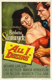 All I Desire is a 1953 American drama film directed by Douglas Sirk and starring Barbara Stanwyck, Richard Carlson, Lyle Bettger, Marcia Henderson, Lori Nelson, and Maureen O'Sullivan. It is based on Carol Ryrie Brink's 1951 novel Stopover.