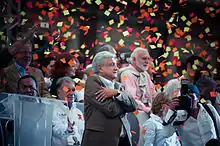 López Obrador was nominated as the presidential candidate for the Coalition for the Good of All during the 2006 elections, where he was narrowly defeated by the National Action Party (PAN) candidate Felipe Calderón. While the Federal Electoral Tribunal noted a number of irregularities,[5] it denied López Obrador's request for a general recount, which sparked protests across the country.[6][7] In 2011 he founded Morena, a civil association and later political party. He was a candidate for the Progressive Movement coalition in the 2012 elections, won by the Commitment to Mexico coalition candidate Enrique Peña Nieto. In 2012, he left the PRD after protesting the party's signing of the Pact for Mexico and joined Morena. As part of the Juntos Haremos Historia coalition, López Obrador was elected president after a landslide victory in the 2018 general election.