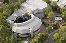 The next year saw the opening of the current outdoor theatre, whose name was changed from Elizabethan to Allen Elizabethan Theatre in October 2013.[25] Patterned on London's 1599 Fortune Theatre and designed by Richard L. Hay, it incorporated all the stage dimensions mentioned in the Fortune contract. The trapezoidal stage was retained but the façade was extended to three stories, resulting in a forestage, middle stage, inner below, inner above (the old balcony), and a musicians' gallery. The wings were provided with second-story windows. Each provides acting areas, creating many staging possibilities. A pitched, shingled roof enhances the half-timbered façade. A windowed gable was extended from the center of the roof to cover and define the middle stage. Just before each performance, an actor opens the gable window, and in keeping with Elizabethan tradition signaling a play in progress, runs a flag up the pole to the sound of a trumpet and doffs his cap to the audience.