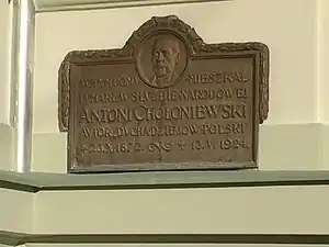 - Kamilla Florentyna Maria Chołoniewska - née Głuchowska (1877-1936), was a social activist, writer, journalist, teacher and entrepreneur. During the First World War, she organized help for Polish legionnaires and political prisoners. Later she was active in various women's associations, especially as the president of the "Association of Scientific Assistance for Women", allowing students to study higher education by granting scholarships. While in Bydgoszcz with Antoni, she founded and ran a workshop and a school. As a supporter of women's higher education, she co-founded the first female gymnasium in Lviv. In 1934, she took over the leadership of the "National School of Homework" in Warsaw.
