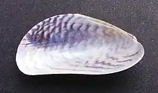 This species is differentiated from other mussels by its relatively small size and inflated shape, as well as by the greenish colour of its outer periostracal layer. The shell has radiating reddish lines on its posterior surfaces, small internal teeth on the dorsal edge posterior to the ligament, and small ribs anterior to the umbones. It can grow up to 30 millimetres (1+18 in) in length.[2][3] It is also known for its relatively fast growth and has a maximum lifetime of about two years.[4]