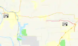 The route begins at its southern terminus, Highway 38 in the unincorporated community of Old Austin. Highway 319 runs north through Ward, briefly concurring with Highway 367 before turning west and crossing US 67/US 167 (Future I-57) at an interchange. The route continues west across Highway 5 to terminate at Highway 107 south of Vilonia.[4][3]