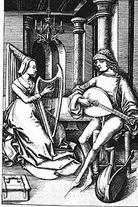 The Tabulaturen etlicher lobgesang is the earliest extensive source of German lute music and also one of the earliest published collections of lute music known.[44] There are fifteen lute pieces, twelve of which are duets for voice and lute. The pieces are organized by difficulty, which reflects the didactic aspect of the Tabulaturen.[45] Curiously, Schlick does not include performing instructions, which are commonplace in most later German publications,[45] and furthermore, no texts are included, although most can be found in contemporary sources—there are just three songs unique to the Tabulaturen (Mein lieb ist weg, Philips zwolffpot and All Ding mit radt). Almost all the songs are settings of German polyphonic Lieder on secular texts. There are two exceptions. The first, Metzkin Isaack, may be of Netherlandish origin, and there is a possibility that Schlick learned the piece from Petrucci's Harmonice Musices Odhecaton. This would imply that Schlick borrowed the idea to apply for an imperial privilege for Spiegel and Tabulaturen from Petrucci.[46] The second exception is All Ding mit radt, which is different from every other piece in the Tabulaturen: it relies not on the phrase structure of the song, like other settings, but rather on motivic and harmonic principles. Also, unlike other lute settings, it does not use bar form.[47]