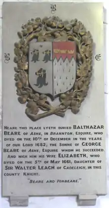 Ash is said by Polwhele[49] to have passed to a junior branch of the family of Beare, lords of the manor of Huntsham.[50] The family of Beare (or "Bere") is ancient and the earliest member recorded is "Baldwin de Bere, lord of Bere" during the reign of King Stephen (1135–1154).[51] They remained at the estate of "Bere" for several generations but later moved to the manor of Huntsham which had been inherited by marriage. The location of "Bere" is uncertain, it may have been near Ash if it was the estate of Beare in the parish of Braunton described by Risdon (died 1640) as "the ancient dwelling of Richard de Charteray", which later descended via Baron FitzWarin to the Bourchiers, Earls of Bath.[52] It is also known as "Bear Charter". A mural monument survives in Braunton Church in memory of Balthazar Beare (1616–1682) inscribed as follows: