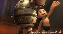 Like what Imagi did with TMNT in 2007, the film was CGI animated on Maya and rendered on Pixar's RenderMan at Imagi's Los Angeles facility and its main studio in Hong Kong. Some changes to Astro's design had to be made in order to appeal to a western audience and making the leap to CGI. The more challenging was his kawaii portrayal, part of which were his large eyes and curly eyelashes, features that the filmmakers thought made him too feminine. Imagi had several discussions on how round and curvy Astro's body proportions should be and in the end they were made slimmer. The by-product of these changes was Astro's Caucasian look.[15] In early development Astro's design was young, resembling his iconic design of a 9-year-old boy. The design team changed that and made him look like a 13-year-old to appeal to a larger audience.[15] They also gave him a white shirt, and a blue jacket since they thought it would be strange to have a normal boy running around without one.[16] They also replaced his heart-shaped energy core with a glowing blue one.[17]