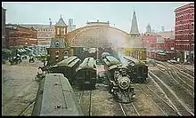 Atlanta's second Union Station was built in 1871 on the site of the 1853 station, burned in mid November 1864 when Federal forces left Atlanta for the March to the Sea. It was built in Second Empire style, designed by architect Max Corput. It was located at what is now Wall Street between Pryor Street and Central Avenue.