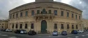 The Portuguese Balì Fra Gaspare Carneiro had bought the site in 1693 against a payment to the Treasury of the Order.[3] Palazzo Carneiro was built in 1696, by Fra Carneiro, on a site where a lime kiln had stood.[4] The building was designed by the Maltese architect Carlo Gimach,[5] who was a personal friend of Carneiro. The building was one of the last examples of austere and staid architecture in the 17th century, before the much more ornate Baroque style became more popular.[6]