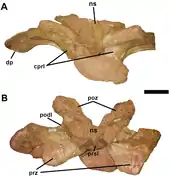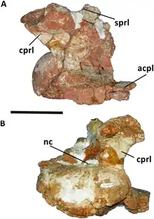 Several traits show that Austroposeidon was a titanosaur; the hyposphene-hypantrum articulations are missing from the vertebrae, the cervical and dorsal vertebrae do not have forked neural spines, and the internal texture of the bone is camellate (punctuated by many small air chambers). The describers determined that Austroposeidon was a new genus based on a number of autapomorphies (traits unique to the known fossils) in the vertebrae: the thirteenth cervical vertebra has columnar centropostzygapophyseal laminae, and its rear centrodiapophyseal lamina splits into two prongs; the first dorsal vertebra has front and back centrodiapophyseal laminae that curve downwards and outwards, and its diapophysis stretches down to the top margin of the centrum; and the frontmost part of the spinoprezygapophyseal laminae forks in the dorsal vertebrae positioned towards the back of the torso. Additionally, Austroposeidon possesses a unique combination of other vertebral traits, not seen elsewhere among titanosaurs.[1]