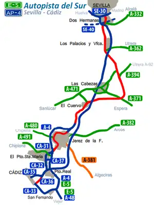 The Autopista AP-4 (also called Autopista del Sur) is a Spanish autopista route which starts in Seville and ends in Cádiz. It has a total length of 123.80 km.