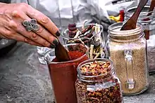 The vast majority (90%) of ayurvedic remedies are plant based.[58] Plant-based treatments in ayurveda may be derived from roots, leaves, fruits, bark, or seeds; some examples of plant-based substances include cardamom and cinnamon. In the 19th century, William Dymock and co-authors summarized hundreds of plant-derived medicines along with the uses, microscopic structure, chemical composition, toxicology, prevalent myths and stories, and relation to commerce in British India.[59] Triphala, an herbal formulation of three fruits, Amalaki, Bibhitaki, and Haritaki, is one of the most commonly used[60] Ayurvedic remedies.[61][62] The herbs Withania somnifera (Ashwagandha)[63] and Ocimum tenuiflorum (Tulsi)[58] are also routinely used in ayurveda.