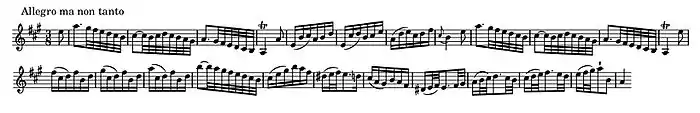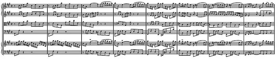 The two bar "motto" or Vordersatz opening the ritornello, consisting of rhythmic spiccato quaver figures in the strings and cascading broken chord semiquavers in the harpsichord, recurs throughout the movement, heralding solo episodes for the harpsichord. In the remainder of A section, the second episode is introduced by the two bar motto and followed by a reprise of the entire first half of the ritornello. Section B starts with an 8-bar solo episode and has three more solo episodes, punctuated by the two-bar ritornello motto. In the second bar of the first episode the sustained harpsichord material is heard in counterpoint to the motto theme in the strings, now starting in the middle of a bar. The second and third episode are 6 bars long in E major/F♯ minor and B minor/C♯ minor. The fourth and longest, which ends section B, is 12 bars long, starting in C♯ minor and ending back in the tonic key of A major. Section A′ starts at bar 79 with what sounds like a reprise of the ritornello—the two-bar motto in its original key; but, as Bach did in many of his concertos, it is interrupted by a solo episode for harpsichord—a variant of the episode introducing section B—before the true reprise of the complete ritornello that concludes the movement.[11][4][2]