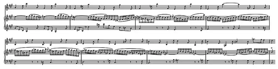 At the cadence there is a full orchestral tutti—the lowest strings once more joining the ripieno section—in a version of the opening ritornello, but now with a rising chromatic fourth in the top notes of the first violin, as the key modulates to F♯ minor. The harpsichord enters with a five bar episode formed by three phrases starting on sustained notes off the beat: the first three bars long with a falling chromatic fourth in the left hand of the hand harpsichord; the second and third, fragmentary one bar statements. These lead into a full recapitulation of the eight-bar Seitensatz, but now with darker colours: the harpsichord starts lower down in the key of D major and the left hand part is joined by the lowest strings. At the end of this episode, back once more in the home tonality of F# minor, the movement concludes with a reprise of the opening ritornello.[12][13][14][15][16]