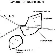 The village has two distinct areas of concentrated settlement, thus making the form that of a fragmented 'double village'. The larger settlement is of polygonal pattern on account of the influence of State Highway No. 1 on settlement structure. However, the settlement in the secondary settlement region is circular. The internal lanes are clustered with rectangular houses on both sides.