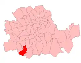 The constituency was defined in terms of wards of the metropolitan borough as they existed in 1918: it comprised the entire Tooting ward and the part of the Balham ward which lay to the west and south of the centre of Balham Hill, Balham High Road, Ormeley Road, Cavendish Road and Emmanuel Road. The remainder of the Balham ward was in another of the Wandsworth divisions, Clapham.[3]