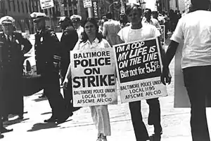 The Baltimore action was one of a handful police strikes in the United States since the Boston Police Strike of 1919,[1] and was followed by a wave of police unrest in U.S. cities.[2] The action was also test case for the American Federation of State, County and Municipal Employees (AFSCME), which was rapidly growing in size and strength but had not had much success in unionizing police officers.