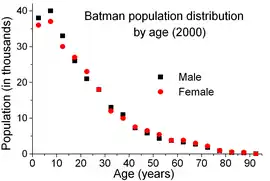 The population of the province is rapidly growing as a result of the inflow of workforce to the capital. Between 1990 and 2000, its population was rising at a rate of 5% per year. The population was stable in Beşiri and Gercüş, increasing by 1% per year in Kozluk and Sason and decreasing by 3% per year in Hasankeyf.[20] The total population was 608,659 in 2019 with 460,955 people living in the urban areas, mostly in the capital. It was 49.8% female.[21]