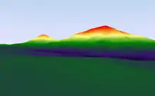 A unique geological feature of Battle Mountain is that the western slope outcrops are composed entirely of alkali feldspar granite, while the eastern slope up to and including the summit is entirely rhyolitic. This provides strong evidence of a theorized lateral explosive eruption event centered on the eastern slope at approximately 704 Ma as proposed by Woolman (2016). Further mathematical geology evidence which supports this theory includes a palaeogeographic reconstruction of the mountain by Woolman utilizing artificial neural networks and Markov chain geostatistical models including period climate condition-based soil erosion rates, Kirkby's hillslope movement evolution equations and recursive biogeochemical soil erosion rates in felsic granitic conditions. The result was the digital reconstruction image shown on the left, indicating what Battle Mountain may have looked like 704 million years ago on the western slope.