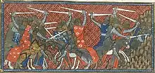 ![]() Miniature of the battle of Andernach between Charles the Bald and Louis, his nephew. Image taken from f. 231v of Chroniques de France ou de St Denis. | |||||||||