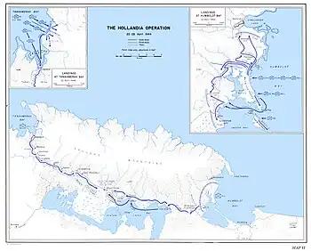 The 41st Division was to stage from Cape Cretin, while the 24th would depart from Goodenough Island.[41] After rehearsals and loading, on 16 to 18 April the amphibious forces sailed from their bases at Finschafen and Goodenough Island; they joined up with other ships carrying troops bound for Aitape from Seeadler Harbour and then rendezvoused with the escort aircraft carriers providing air cover off Manus Island early on 20 April. After taking evasive routes to the west of the Admiralty Islands to avoid air attack,[42] the convoy turned back towards their objective late in the afternoon. The convoy split around 80 miles (130 km) offshore, with the Eastern Attack Group, consisting of troops assigned to Operation Persecution turning away for Aitape. They arrived off Hollandia during the night of 21/22 April and about 20 miles (32 km) offshore, the convoy split again with the Central Attack Group preceding for Humboldt Bay while the Western Attack Group turned towards Tanahmerah Bay. The landings took place at dawn on 22 April after a supporting naval bombardment at each site.[43][44] Meanwhile, carrier-borne aircraft attacked targets around Wakde, Sarmi and Hollandia from 21 April, destroying at least 33 Japanese planes in the air and more on the ground.[45]