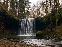 The waterfall is formed as Beaver Creek sheets out onto a wide channel over a 40 foot wide chute at high velocity, falling into a natural amphitheater of layered basalt.[1] Beaver Falls Trail leads to Beaver Falls in 0.3 miles (0.48 km) from a trailhead on Beaver Falls Road.[2] The waterfall and trail are surrounded by Douglas fir, western red-cedar, western hemlock, and big-leaf maple. Sword fern, Oregon grape, and salal are very common plant life growing beneath the forest canopy.[3]