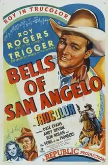 Bells of San Angelo is a 1947 American Trucolor Western film directed by William Witney and starring Roy Rogers. The first Roy Rogers film shot in Trucolor, this modern day Western mixes half a dozen songs with mystery, international smuggling of silver, violence, a pack of dogs and comedy relief with one character packing a "16-shooter".