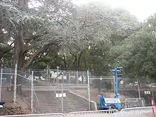 Police fences surrounding the Berkeley Memorial Stadium oak grove.