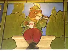 Renard with a mug of Bevo, depicted in terra cotta on the interior walls of the Bevo building, St. Louis