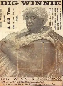 "Big Winnie" Johnson (c. 1839 – September 4, 1888) was an American "Fat Lady" sideshow performer in the 1880s. Despite the relatively short span of her career, she became very well-known, performing for circuses and dime museums across the country. She was remembered for the exceptionally high salary she commanded as a Black "Fat Lady" performer in the United States, especially in northern Midwestern cities including Chicago and Cincinnati.