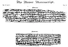 The Bower Manuscript is one of the oldest Sanskrit texts on birch bark in the Brāhmī script. It includes several texts covering subjects including a medical treatise and proverbs. It was discovered in Kucha (currently in Aksu Prefecture in Xinjiang, China), an ancient Buddhist kingdom on the northern Silk Road, and is estimated to be from around 450 CE.[10]