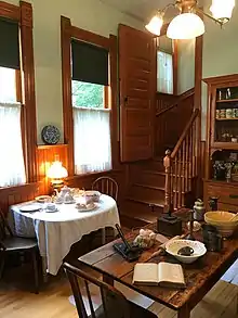 Ernest's grandfather died in May 1905, leaving the home to his daughter, Grace. By October, Grace had sold the house to Samuel Nissen, an Oak Park grocer.[7] The Nissen family lived in the North Oak Park Avenue house for fifteen years, replacing the front porch with a screened-in porch in 1914 and later replacing the clapboard exterior with aluminum siding. During the 1920s through the 1940s, the house was converted into a rooming house. The larger living areas and hall were divided and a bathroom was installed on the first floor. In 1951, the house was remodeled again to create a two-family residence.[8]